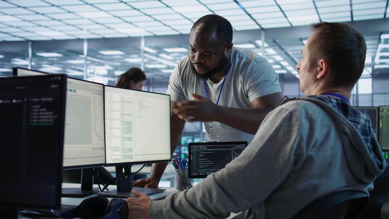 Engineer having fun with colleague at work in data center establishment, making jokes. Team of technicians making each other laugh, bonding in server room, doing fist bump gesture , camera B Pro Video