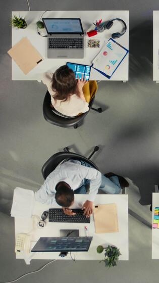 Vertical Top down view of coworkers engaged in consulting and report sharing at office. Professional team reviews visual data and documents to enhance business strategy and performance goals. Camera A. Pro Video