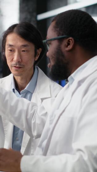 Vertical Clinical microbiologists using microscope to evaluate cellular structures in lab. Diagnostic laboratory colleagues observe medical tissue through magnification tool at workbench Pro Video