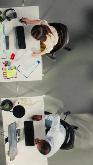 Vertical Top down view zoom in of colleagues sharing reports and visual data on computer. Work team performs risk assessment, strategy planning to ensure strong performance and progress. Camera A. Pro Video