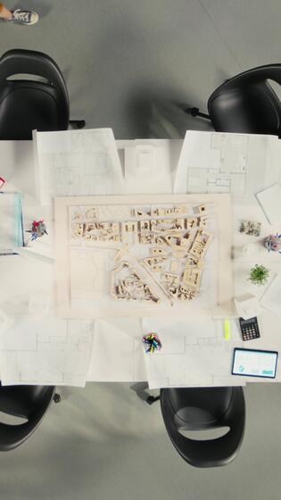 Vertical Top down view of development team consulting on real estate investment and construction strategy. Office features 3D models and documents illustrating modern property design concepts. Camera A. Pro Video