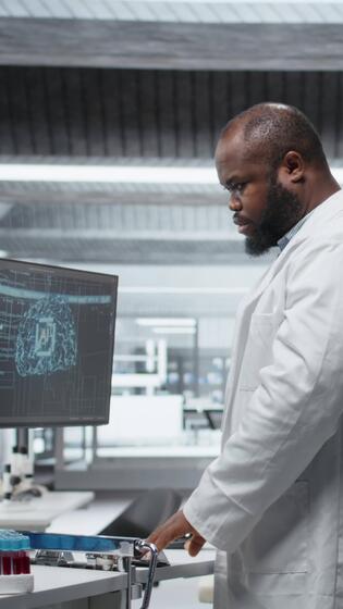 Vertical Black medic using artificial intelligence to observe effect during new drug test, collecting pharmacology data with neural networks system. Biomedicine discovery and innovation. Camera A. Pro Video