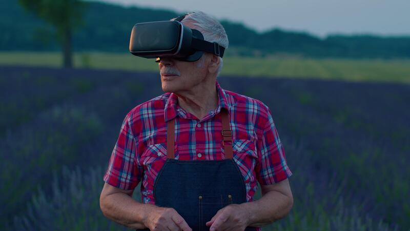 Progressive modern grandfather man farmer in field lavender flowers uses virtual reality technology. Simulating application user interface. Control irrigation system from drones. Modern agribusiness Pro Video