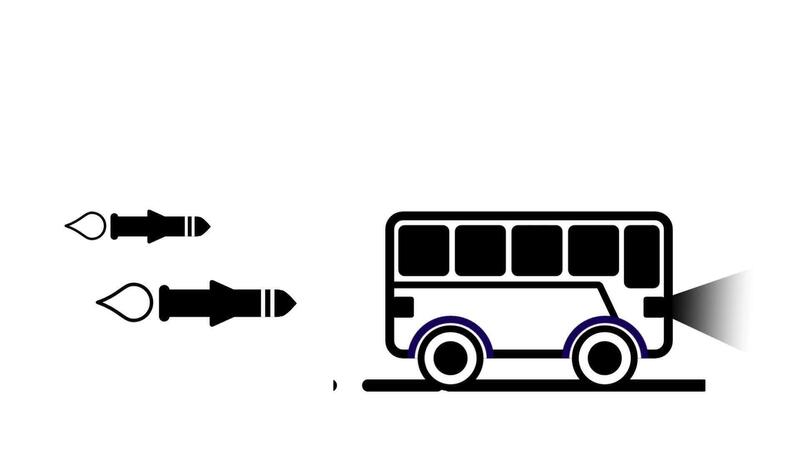 Two rockets approach a moving bus, symbolizing challenges faced by groups or systems under pressure and their resilience in overcoming collective threats Free Video