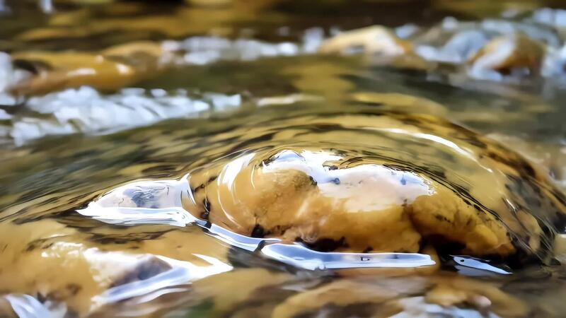 Detailed, low-angle perspective captures the dynamic movement of clear water cascading over smooth, wet river stones, with moss-covered rocks visible on the left. Free Video