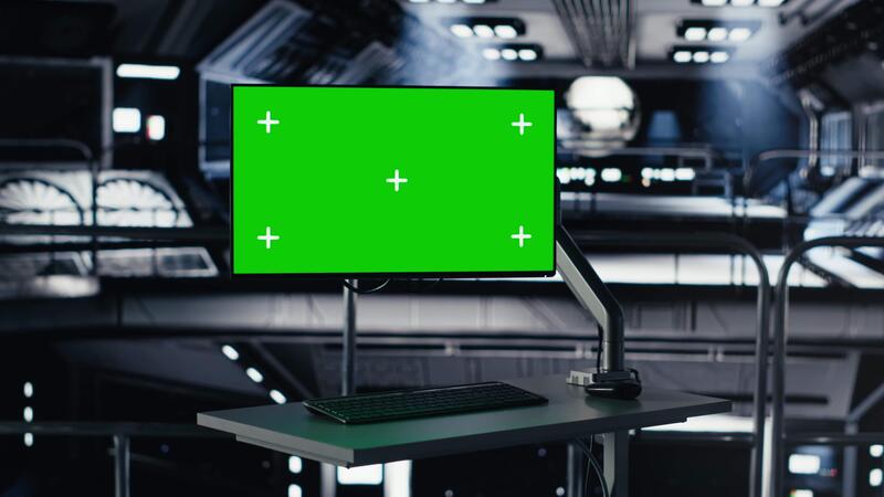 Close up of isolated screen monitor inside futuristic spacecraft bay used for running telemetry software. Chroma key display used for reviewing space station onboard analytics Pro Video