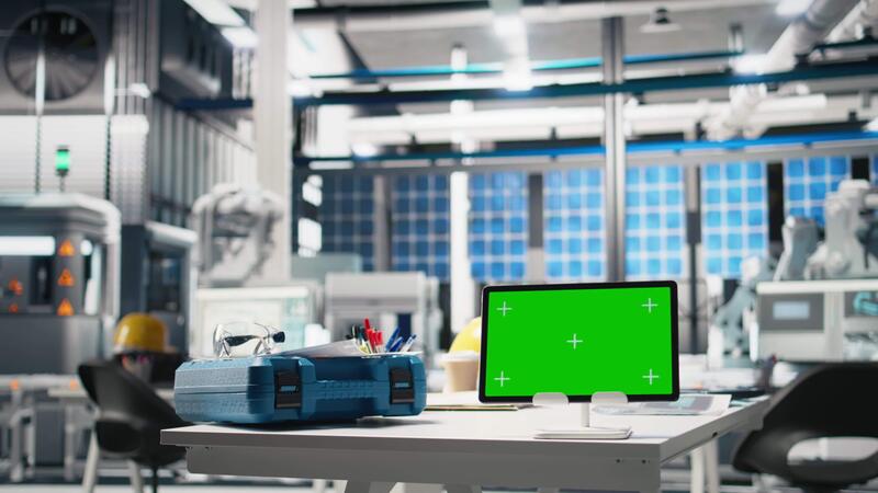 Empty desk and workspace with safety glasses and PC display setup in a solar energy facility, where robotic arms streamline the photovoltaic panel assembly process. Performance metrics. Pro Video