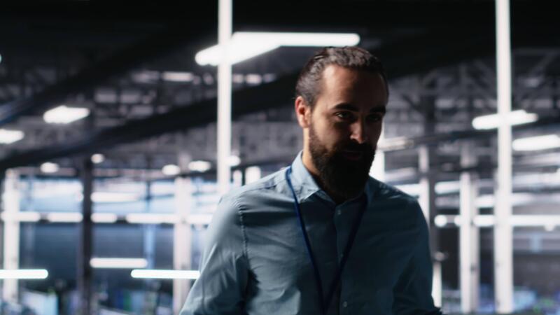 Data center system administrator showcasing supercomputers gear and AI technology, filming presentation tour. Server room IT expert presenting artificial intelligence neural networks tech, camera A Pro Video