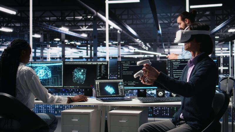 Data center engineer using virtual reality, managing AI systems for uptime and efficiency. IT employee using VR headset and artificial intelligence technology in server hub, camera A Pro Video