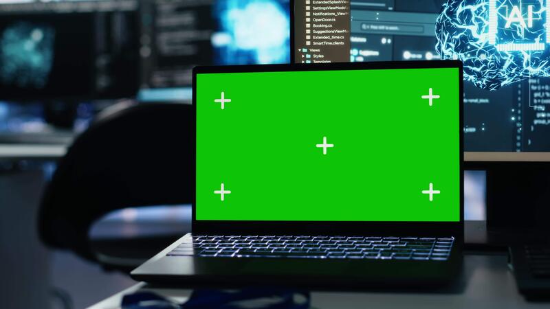 Close up of server hub mockup laptop tracking rigs processing machine learning datasets for artificial intelligence operations. Isolated screen notebook monitoring gear used in AI LLM development Pro Video
