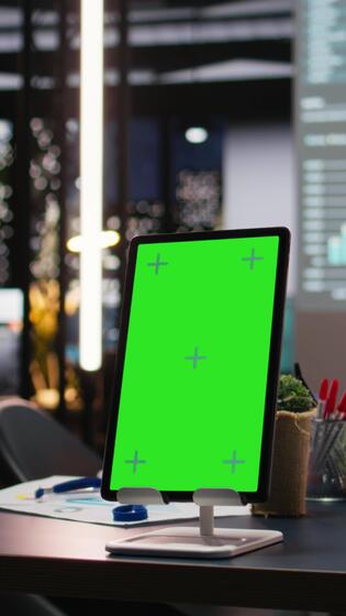 Vertical Modern empty boardroom with copy space on tablet and data charts on projections, computer generated forecasts displayed across the walls. After hours preparation and strategic alignment. Pro Video