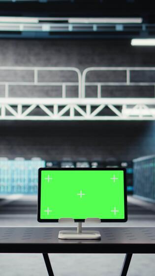 Vertical Green screen tablet in data center used for doing maintenance on infrastructure, improving workload. Mockup device in server farm used by high tech server clusters for parallel processing Pro Video