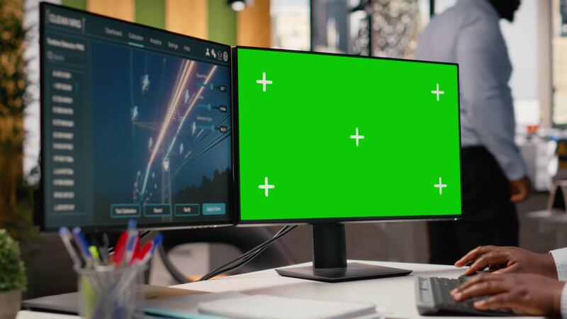 Engineer looks at power lines analytics dashboard on isolated screen PC showing metrics. African american woman uses mockup computer in office used to analyze transmission tower sensor data, camera B Pro Video