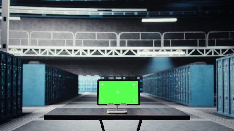 Green screen tablet in data center used for doing maintenance on infrastructure, improving workload. Mockup device in server farm used by high tech server clusters for parallel processing Pro Video