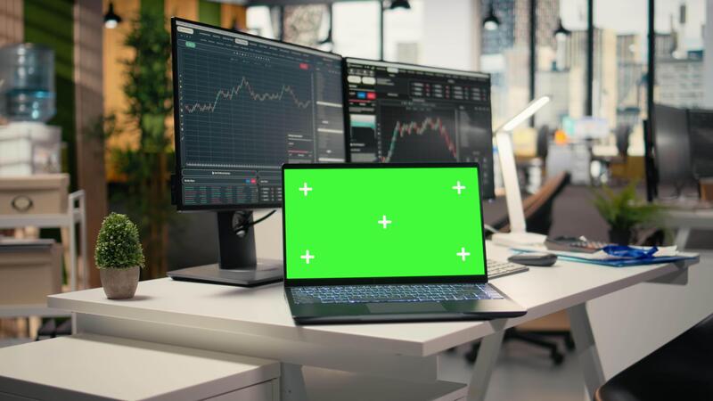 Close up of trading software in forex firm office with graphs on green screen laptop. Mockup notebook on desk used by financial specialists tracking stock exchange activity using analytical tools Pro Video