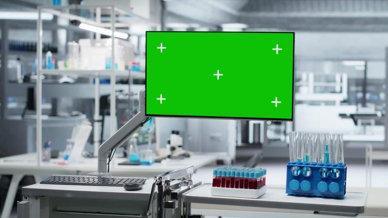 Chroma key monitor in empty research lab ready for scientists to begin testing, featuring data monitors and molecular models symbolizing biotechnology, drug development and progress in science. Pro Video