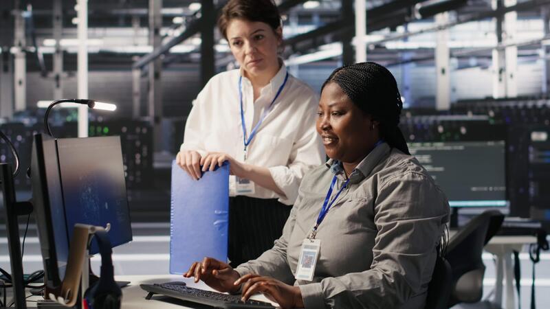 Happy data center manager pleased by work done by team integrating AI automation tools in infrastructure maintenance. Smiling supervisor satisfied by worker upgrading machine learning models, camera A Pro Video