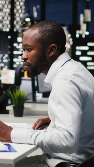 Vertical Black team of employees using virtual AI chatbot to automate text with a prompt and solve daily tasks, enhance productivity. Integration of advanced algorithms and digital tools. Camera B. Pro Video