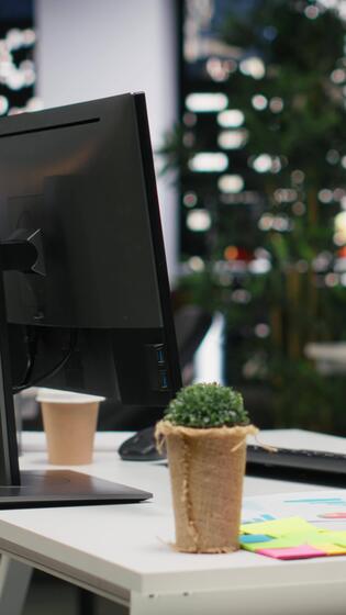 Vertical Empty business office late at night in a multinational company, computers running infographics and graphs prepared for data analysis, management objectives aligned with corporate goals. Pro Video