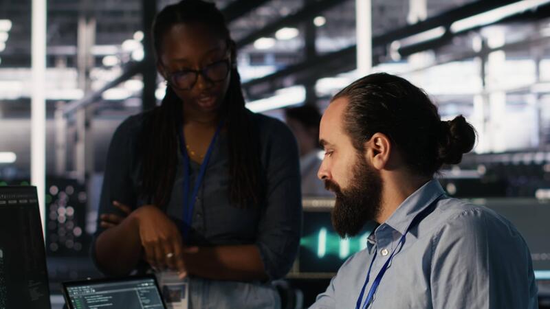 Data center system administrators working together, collaborating on neural network software development. Server hub worker and african american colleague implementing AI tech in workplace, camera A Pro Video