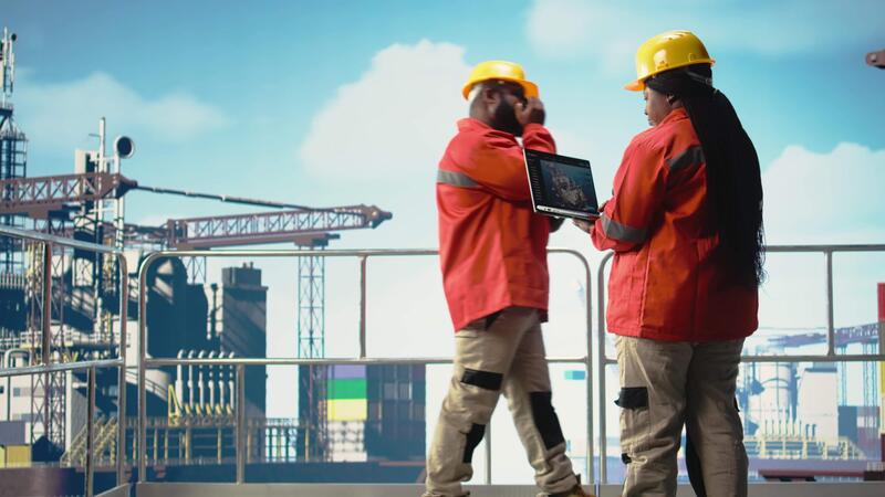 Geologist working for gas company using laptop software to determine optimal offshore drilling locations. Barge engineer looking at well installation sites data on notebook device, camera A Pro Video