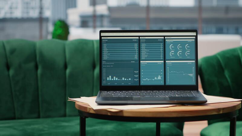 High tech device showcasing infographics and business data in empty office, work environment in a stylish skyscraper downtown building. Growth and luxurious office life in a corporation. Pro Video