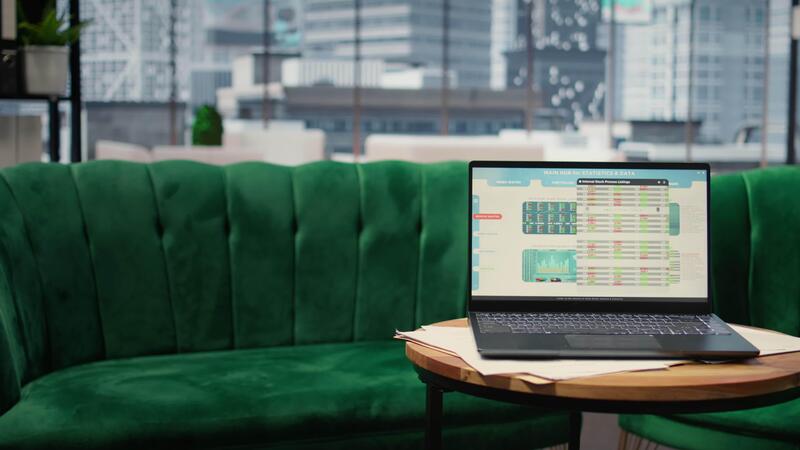 Big data reports and graphics showcasing business corporation success, empty luxurious office with a laptop on the table. Professional workspace with pc display running trends. Pro Video