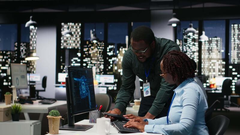 Black team of colleagues use artificial intelligence and predictive analytics, checking smart work solutions and cloud computing for adaptive strategies. AI engineering algorithms. Camera B. Pro Video