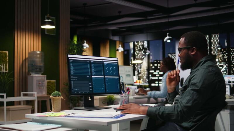 Office worker reviewing KPI metrics on monitor and analytics on desktop, building a vision and business strategy to accomplish objectives and success. Professional mindset after hours. Camera A. Pro Video