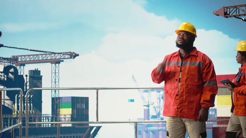 Portrait of happy offshore platform worker speaking in walkie talkie, configuring derrick management systems. Smiling drilling rig worker doing seabed analysis, talking in handheld radio, camera A Pro Video