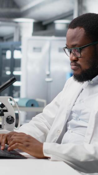 Vertical Lab specialist doing genetics study using clinical equipment, removing eyeglasses, checking analysis results on computer. Man using scientific gear at workbench, doing complex experiments, camera B Pro Video