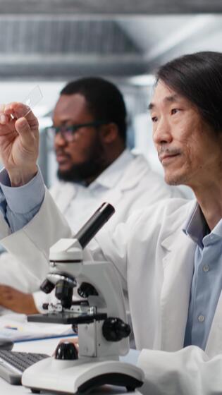 Vertical Senior lab engineer inspecting specimen slide for microscopy study using optical device. Medical laboratory technician reviewing cytology slide for clinical testing procedure, camera B Pro Video