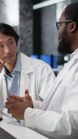 Vertical Team of multiethnic researchers using microscope to evaluate cellular structures in lab. Multiracial colleagues observe medical tissue through magnification tool at laboratory bench, camera B Pro Video