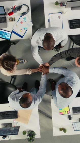 Vertical Top down view zoom in of staff proud of their successful teamwork collaboration, clapping hands after analysis. Employees use data visualization and forecasting for project objectives. Camera A. Pro Video
