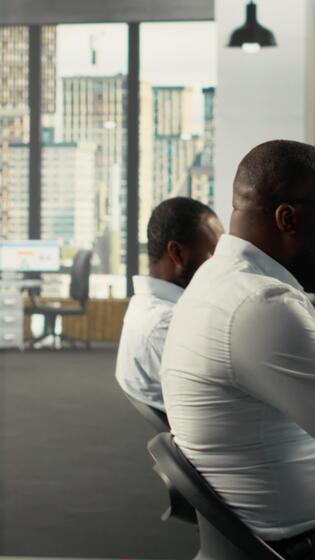 Vertical Coworkers in a multinational company discussing business strategy and performance metrics. Staff consult on forecasting, report sharing and data visualization while aligning objectives. Camera B. Pro Video