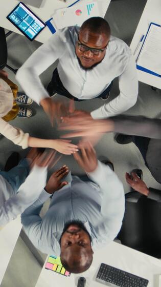 Vertical Top down view zoom out of professional coworkers engaged in report sharing and data visualization. Multiethnic team uses forecasting and documentation to strengthen business strategy. Camera A. Pro Video