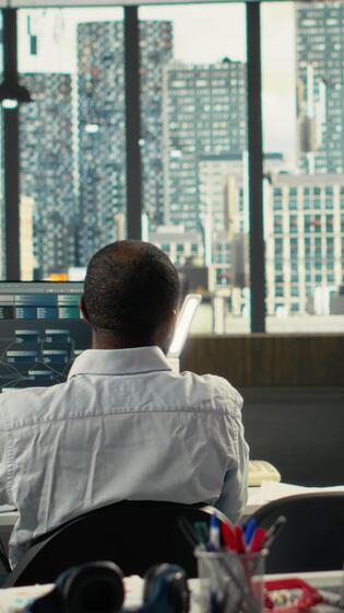 Vertical Secretary assisting colleagues with archived files in modern workplace, reviewing charts and analytics. Employees discuss project progress, report writing and data visualization. Camera B. Pro Video