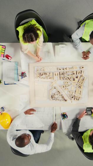 Vertical Top down view zoom in of real estate developers and architects in office reviewing blueprints and 3D models. Development team discusses urban planning and property investment strategies. Camera A. Pro Video