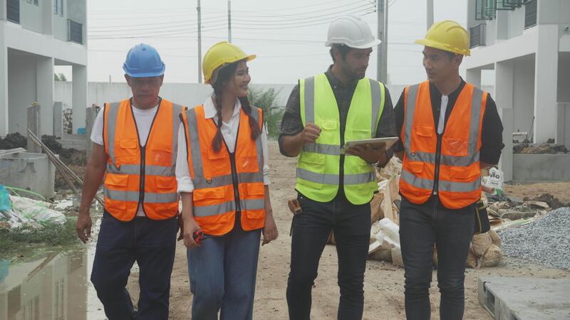 Group team architect and builder walking and looking digital tablet computer for inspect project residential at construction site, contractor and worker discussion and planning, engineer concept. Pro Video
