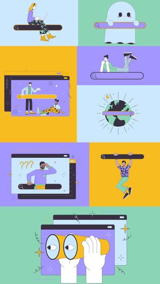 Search engine and online explore bento grid vertical animation. Internet curiosity. Web browsing. Websurfing collage motion 4K web design. Animated cartoon characters collection mood board Pro Video