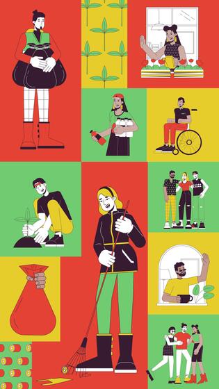 Community cleanup and eco awareness bento grid vertical animation. Garbage sort. Diverse people working together collage motion 4K web design. Animated cartoon characters collection mood board Pro Video