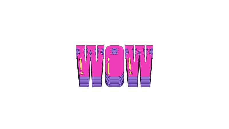 Animated word WOW in dynamic vaporwave typography. Shoutout reaction. Exclamation interjection. Excitement. Smooth text animation with layered shadows sliding up and down. Retro wave motion graphics Pro Video