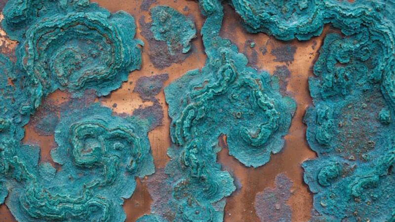 Close up of turquoise formations on a copper surface with intricate layered patterns visible textures patterns background Free Video