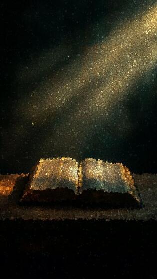 Open Book on Wooden Surface Illuminated by Beam of Light with Floating Particles in Dark Mystical Background, Animation Made of Cubes Pro Video