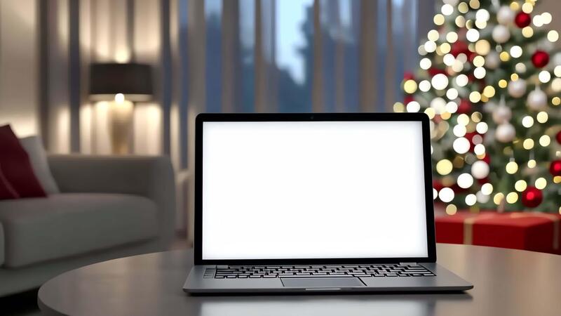 Laptop with White Empty Screen Mock-Up table with a Christmas Tree Lights blurred Background Bokeh. Bright Blank Laptop Display Mock Up Template Against a Festive backdrop. Front View, Close-Up. Free Video