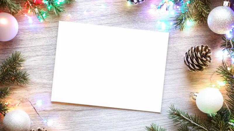 Christmas blank card rustic desk. White greeting card flay lay, top view with holiday decorations. Frame mock up with space for text. Empty paper sheet. Seasons greetings. Template. Business Free Video