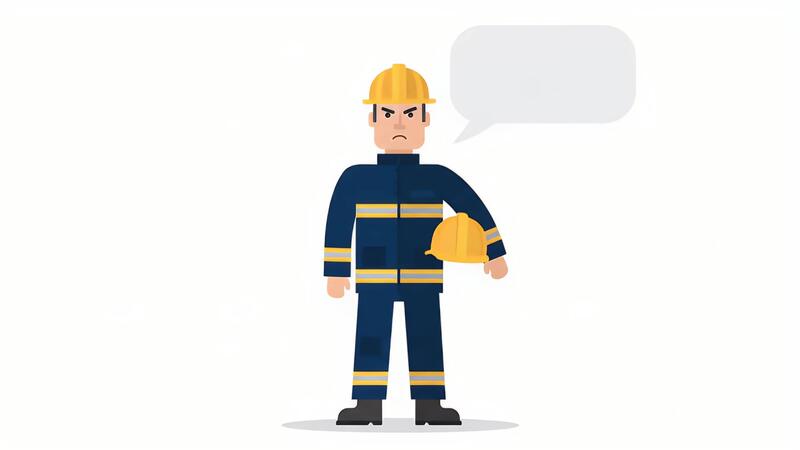 Animated firefighter character with an angry expression, holding a helmet and speaking with a blank speech bubble for custom text Free Video