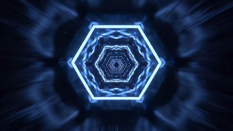 Mesmerizing dark hexagonal tunnel illuminated by vibrant blue neon lights. Infinite futuristic digital corridor with abstract geometric patterns, dynamic glowing reflections, a high-tech visual Free Video