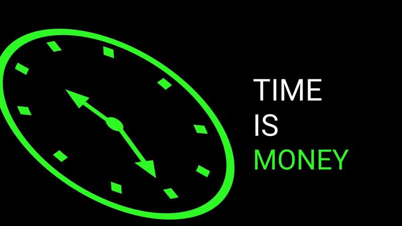 2D animation of a green outline clock with rapidly spinning hands. The white text 'Time Is Money' is displayed on a black background. Minimalist flat design in a seamless loop. Free Video