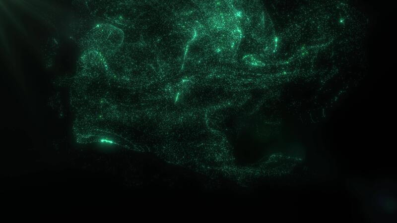 Dynamic animation of glowing green particles forming abstract flowing shapes on dark background. Futuristic digital wave design symbolizing energy, technology, science, and innovation. Pro Video